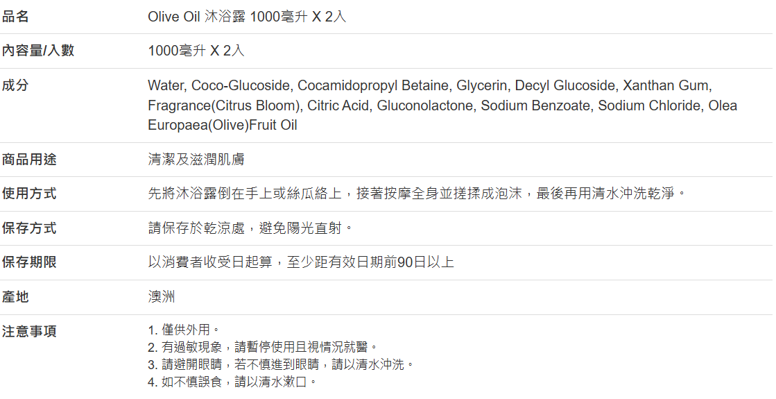 【好市多代購】Olive Oil 沐浴露 1000毫升 X 2入