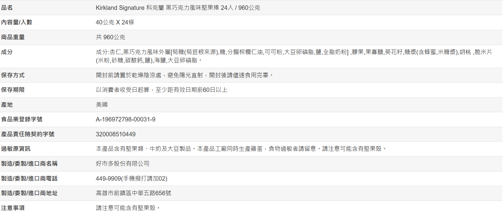 【好市多代購】Kirkland Signature 科克蘭 黑巧克力風味堅果棒 40公克 X 24條