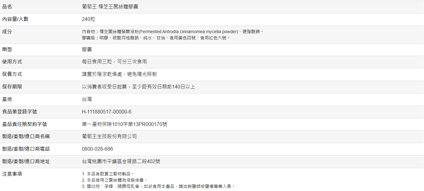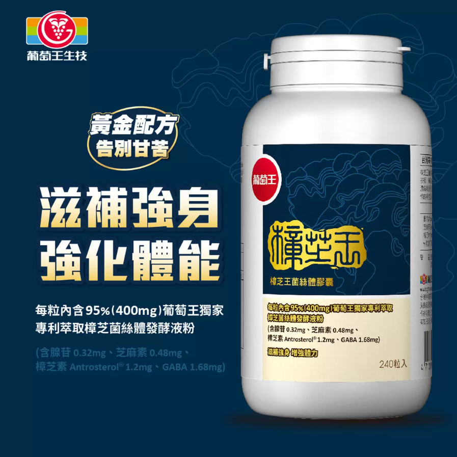 • 葡萄王樟芝王菌絲體乃是「葡萄王生物科技研究所」運用先進技術,精選有「台灣森林珍貴紅寶石」之稱的珍貴牛樟芝菌種,進行液態發酵培養後,再濃縮精製而成,能滋補強身,增強體力,是具有優良活性的養生聖品。