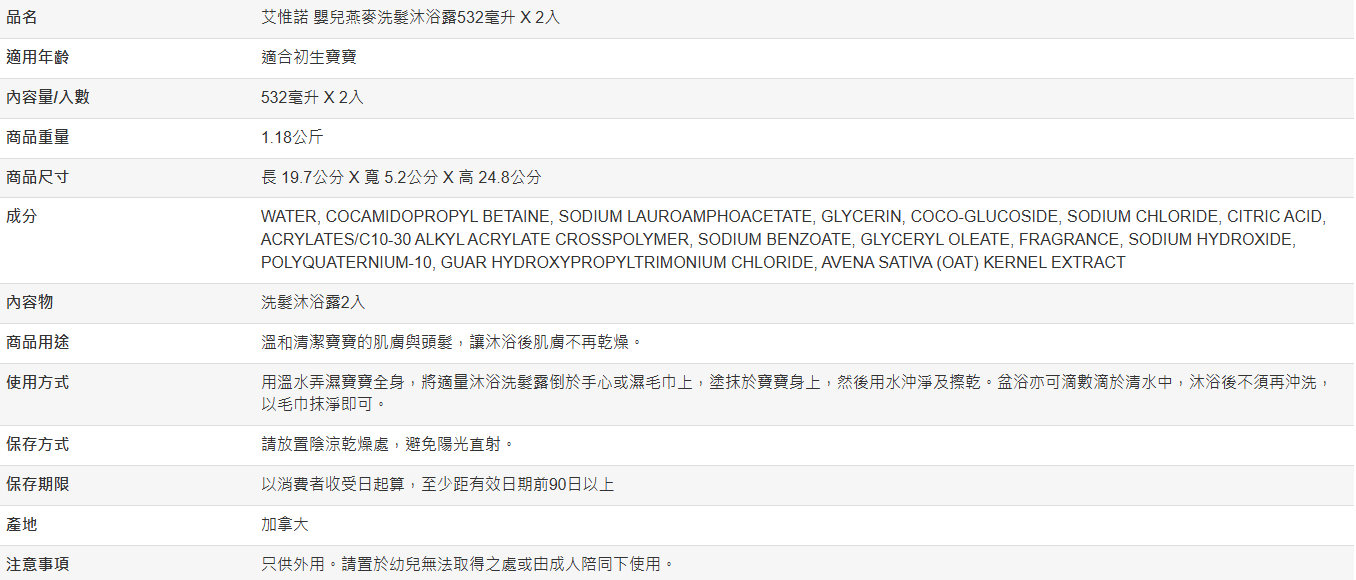 【好市多代購】艾惟諾 嬰兒燕麥洗髮沐浴露532毫升 X 2入