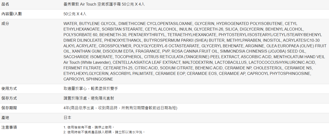 【好市多代購】曼秀雷敦 Air Touch 空氣感護手霜 50公克 X 4入