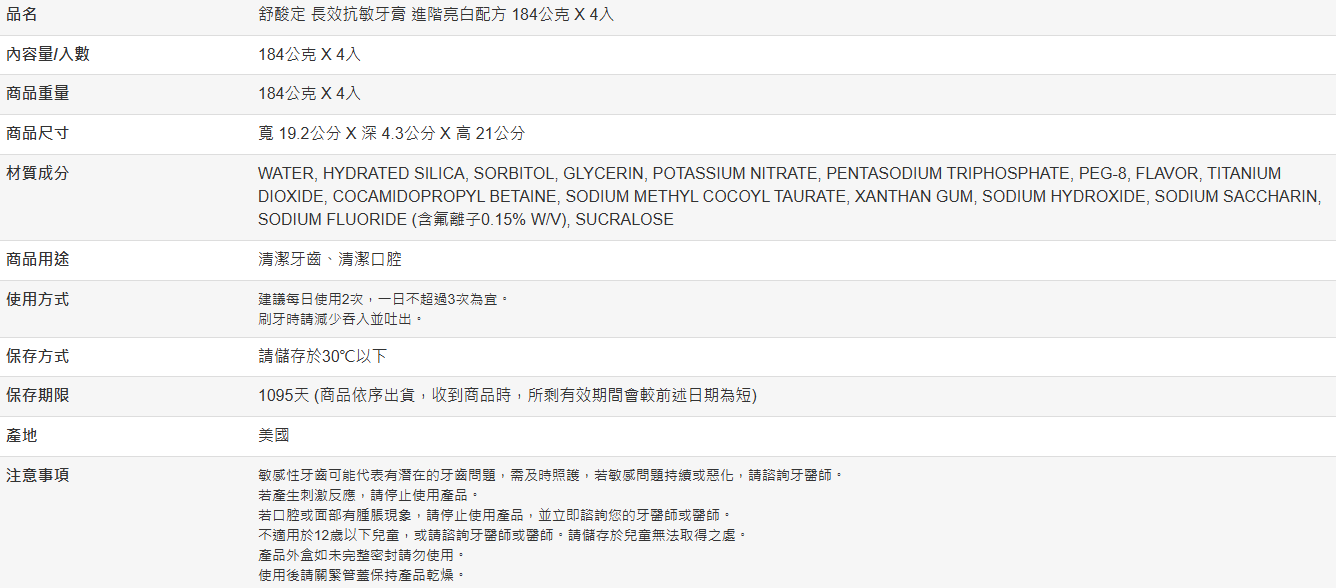 【好市多代購】舒酸定 長效抗敏牙膏 進階亮白配方 184公克 X 4入