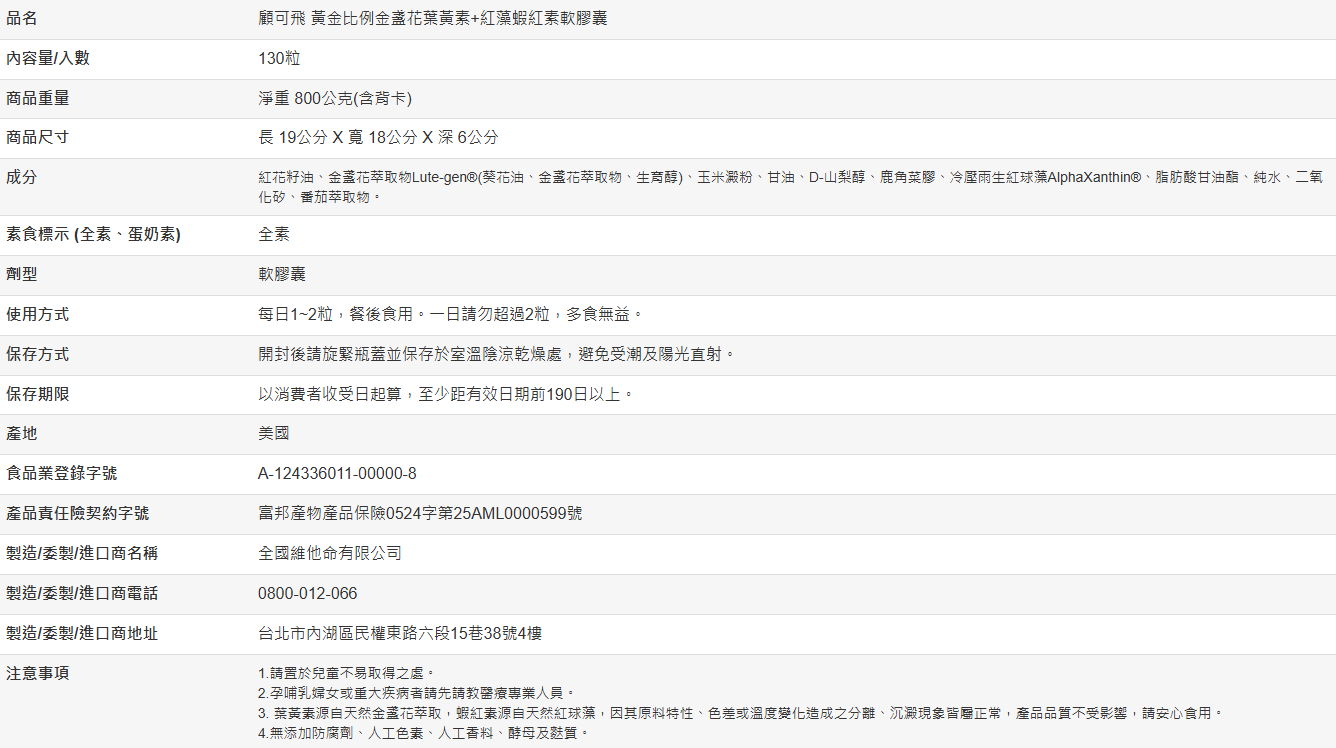 【好市多代購】顧可飛 黃金比例金盞花葉黃素+紅藻蝦紅素軟膠囊 130粒