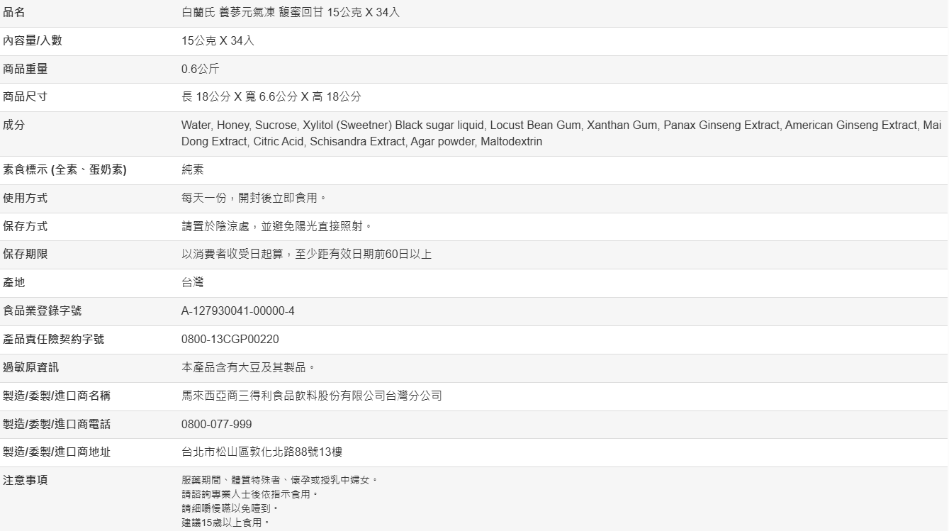 【好市多代購】白蘭氏 養蔘元氣凍 馥蜜回甘 15公克 X 34入