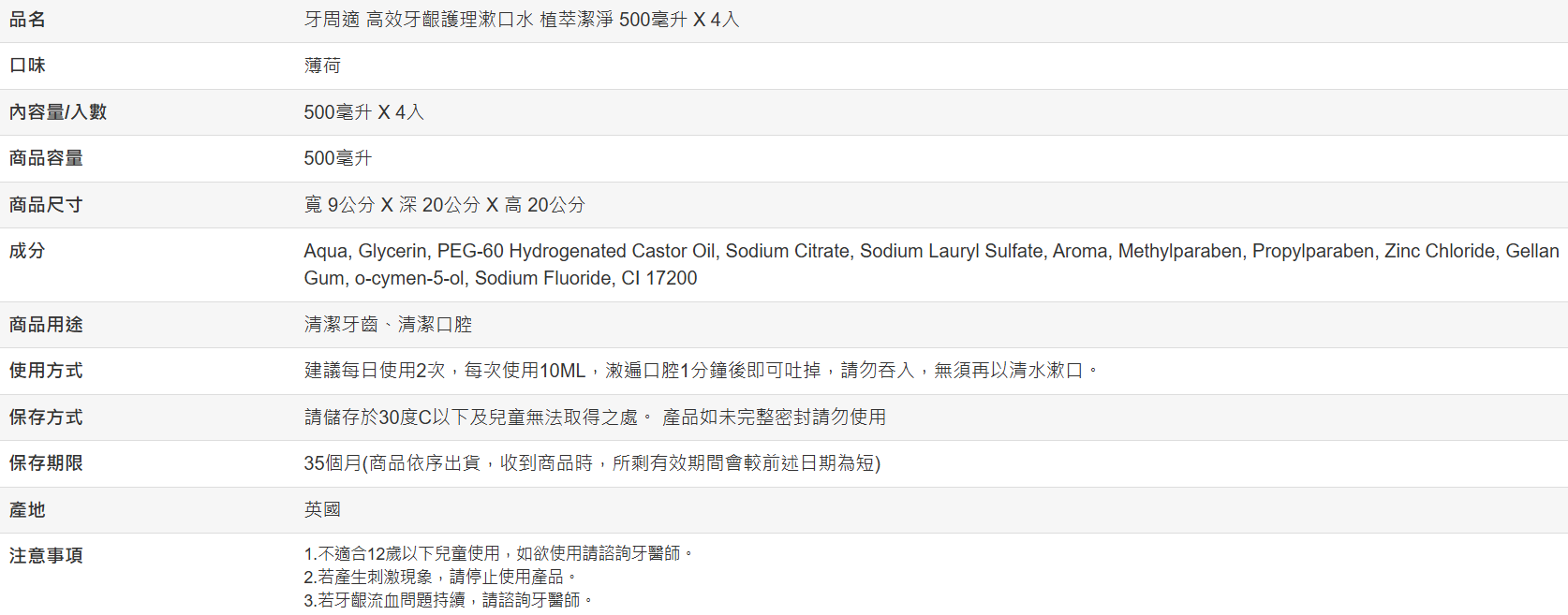 【好市多代購】牙周適 高效牙齦護理漱口水 植萃潔淨 500毫升 X 4入