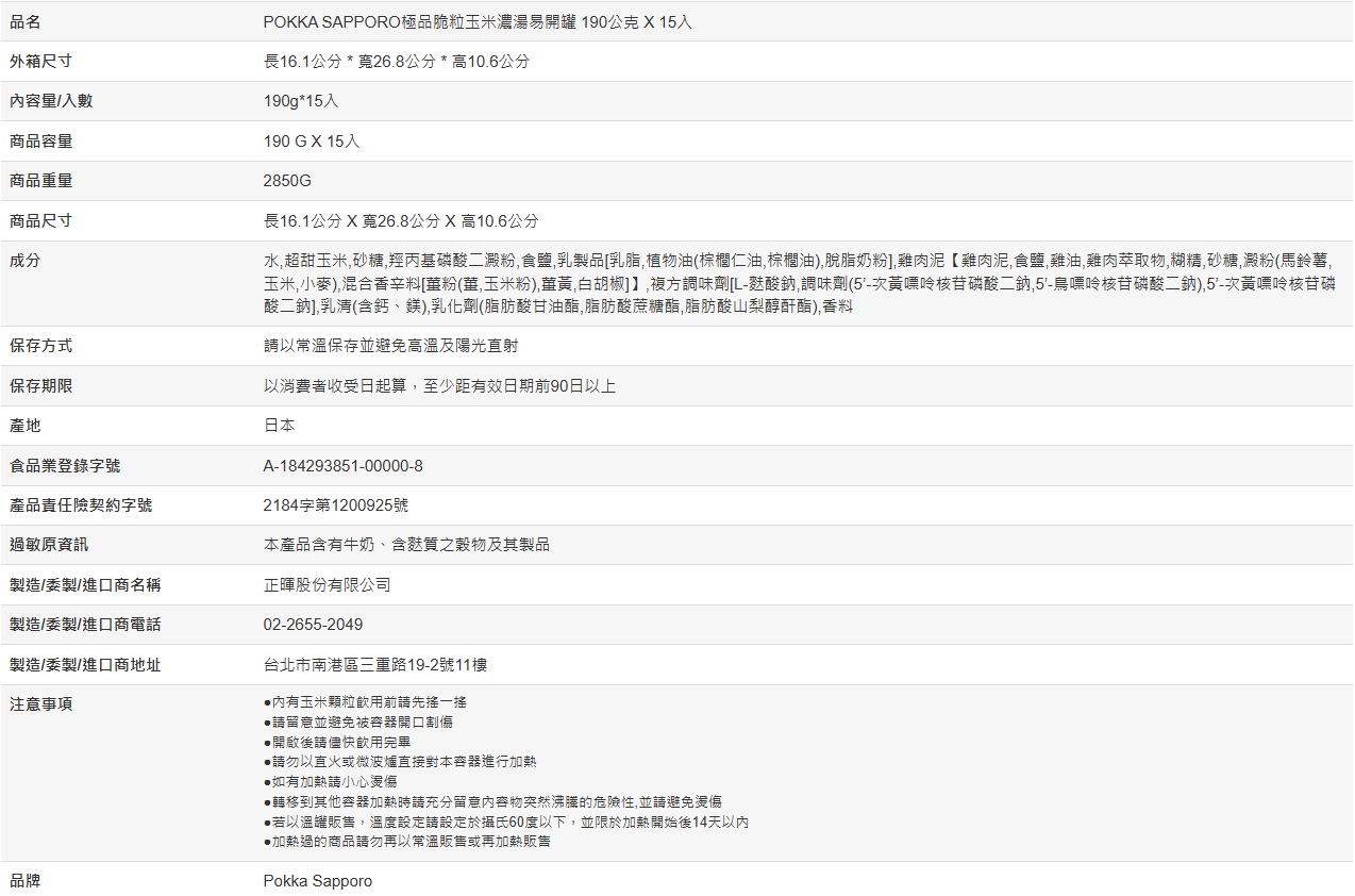 【好市多代購】Pokka Sapporo 極品脆粒玉米濃湯易開罐 190公克 X 15入