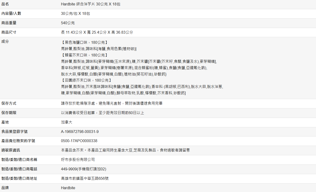 • 黑色海鹽、蜂蜜芥末及 田園綠芥末三種口味 ,每種口味各 6 包共18 包