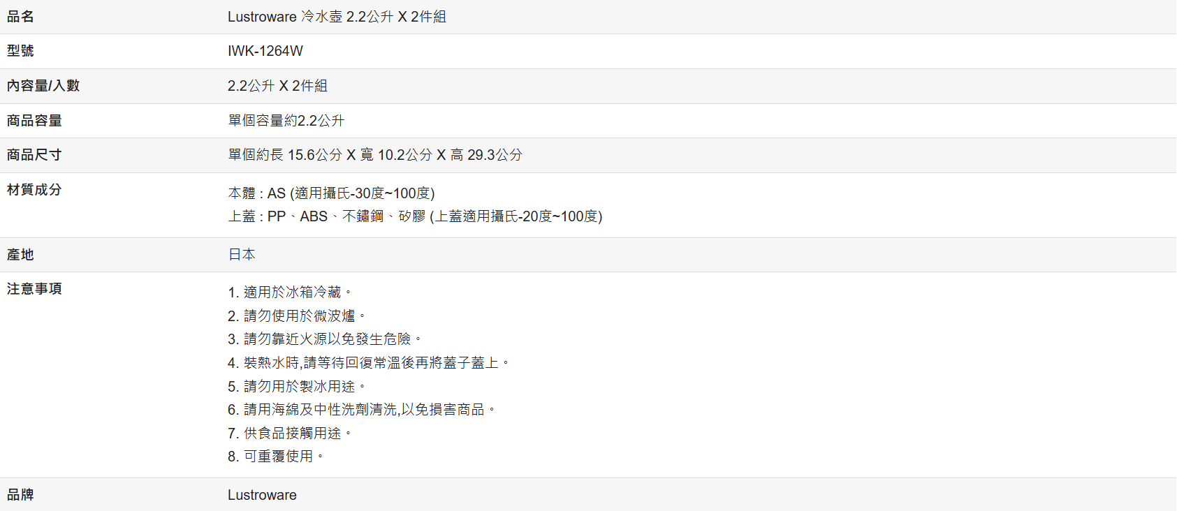 【好市多代購】Lustroware 冷水壺 2.2公升 X 2件組