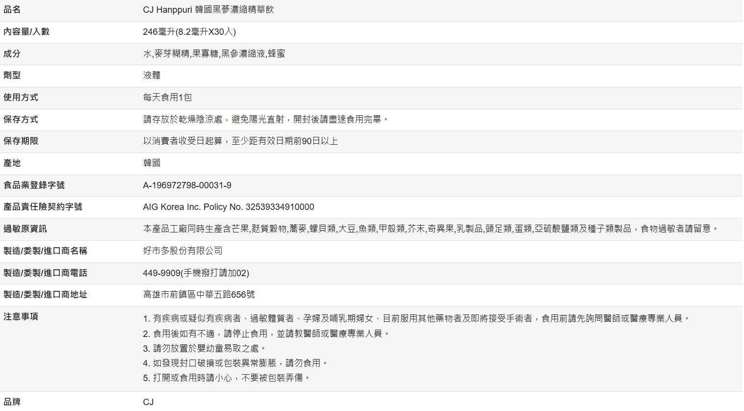 【好市多代購】CJ Hanppuri 韓國黑蔘濃縮精華飲 8.2毫升 X 30入