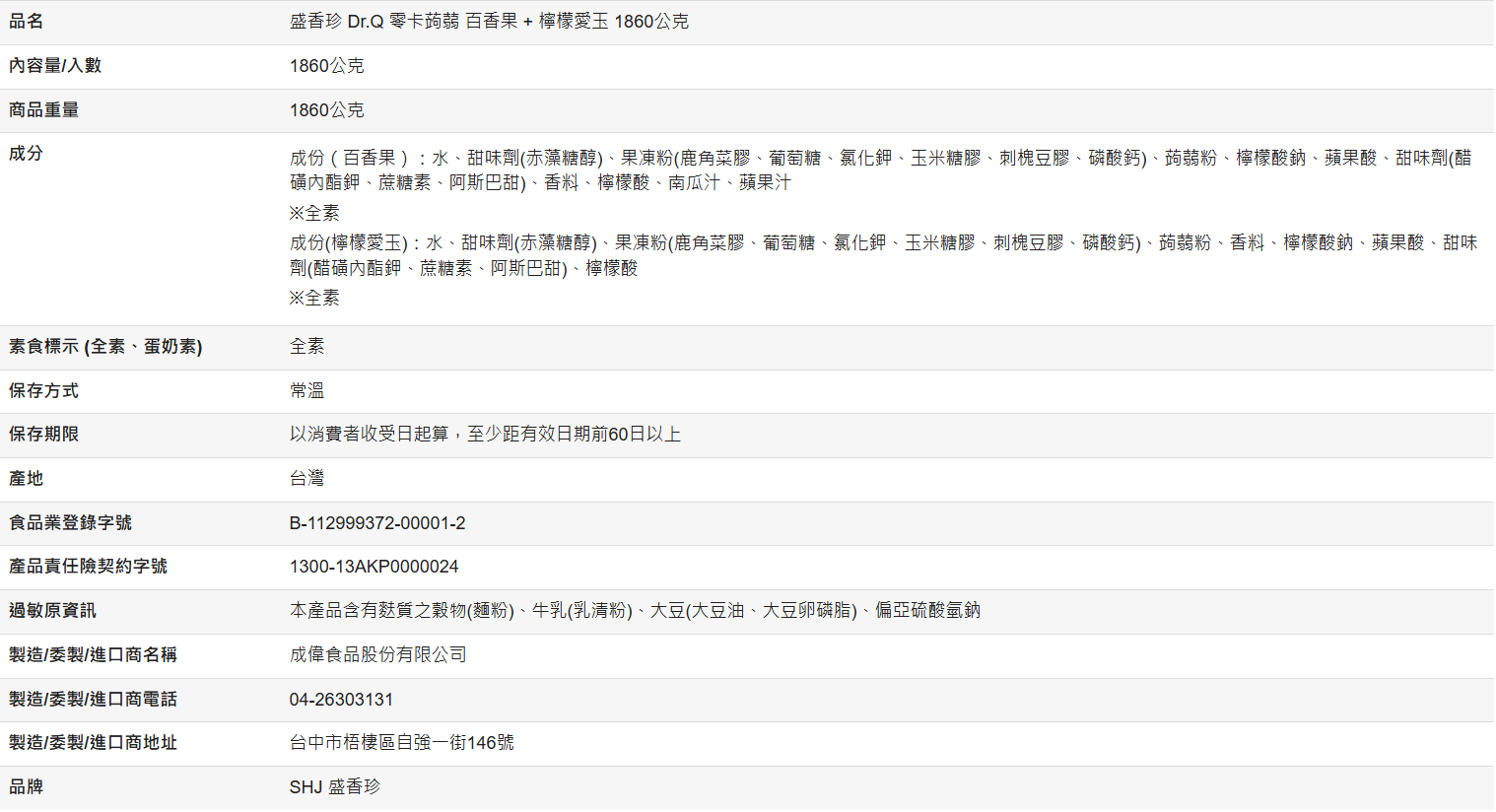 【好市多代購】盛香珍 Dr.Q 零卡蒟蒻 百香果 + 檸檬愛玉 1860公克