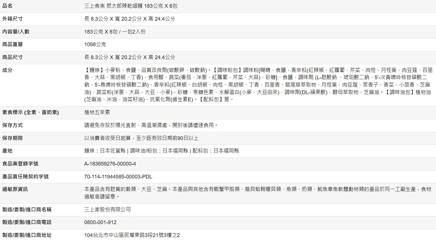 【好市多代購】三上食楽 燃太郎辣乾細麵 183公克 X 6包