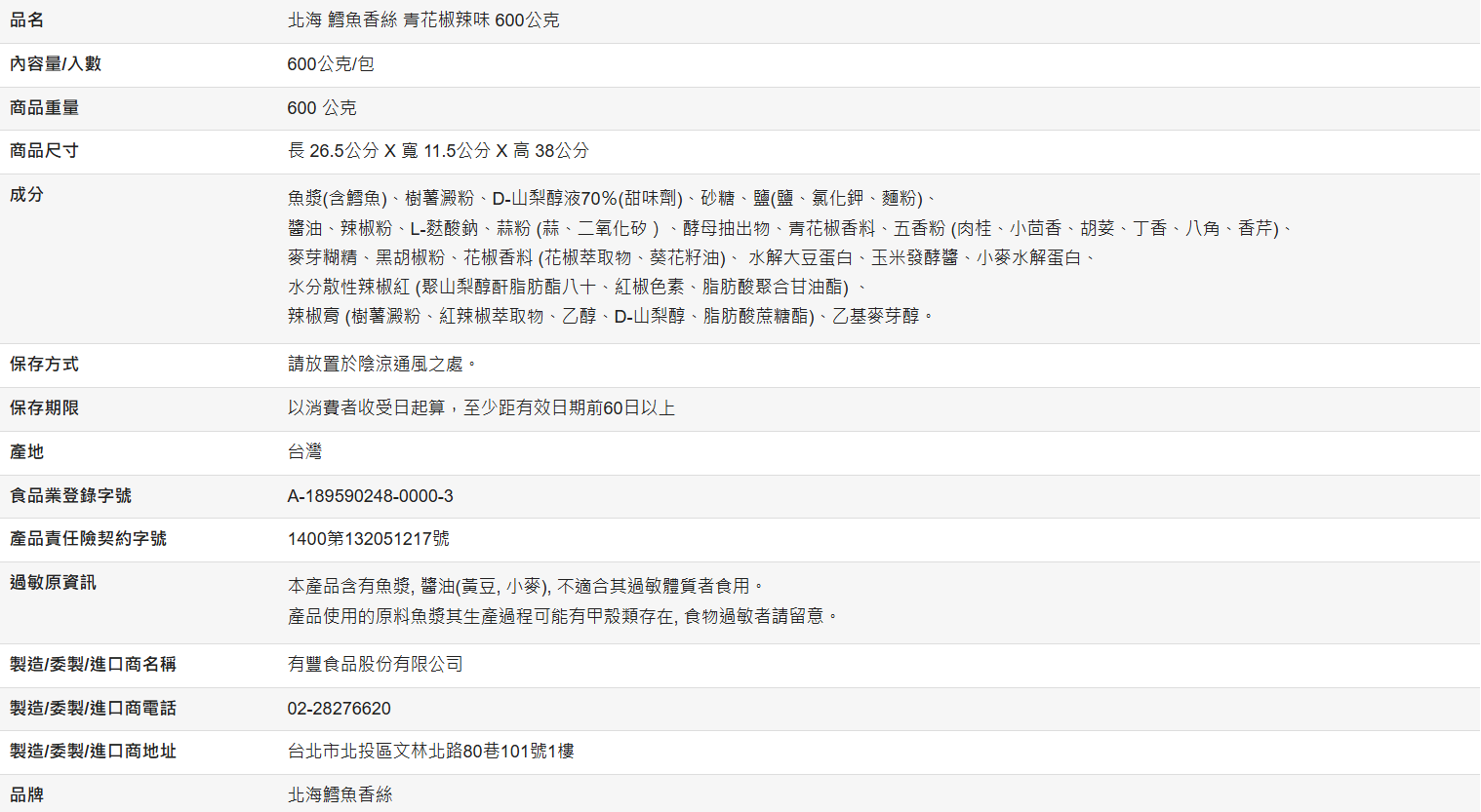 【好市多代購】北海 鱈魚香絲 青花椒辣味 600公克