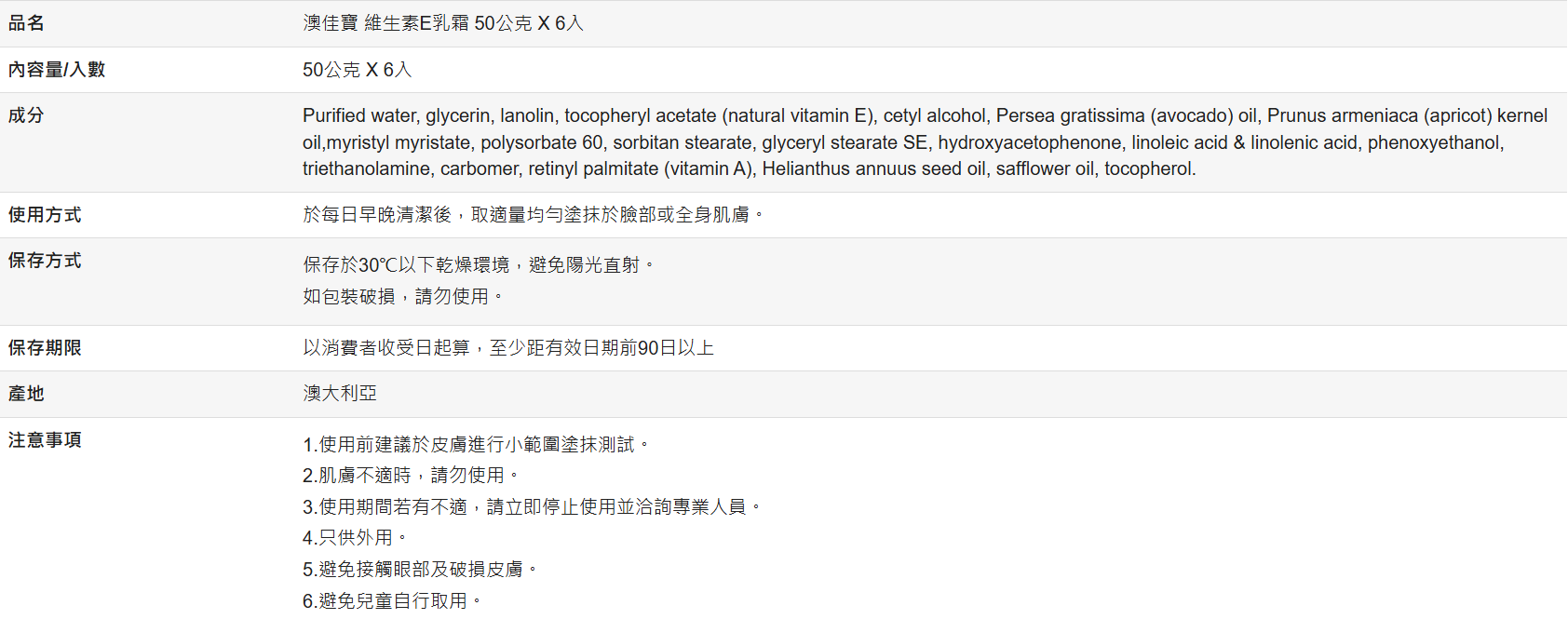 【好市多代購】澳佳寶 維生素E乳霜 50公克 X 6入