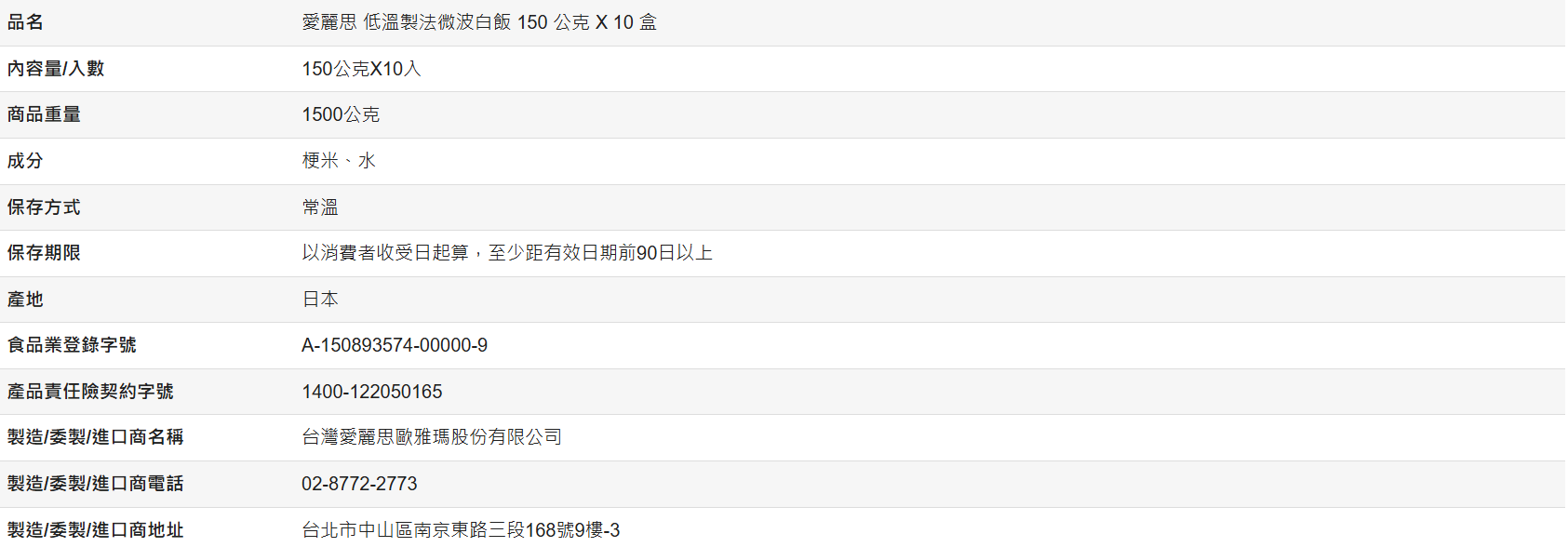 【好市多代購】愛麗思 低溫製法微波白飯 150 公克 X 10 盒