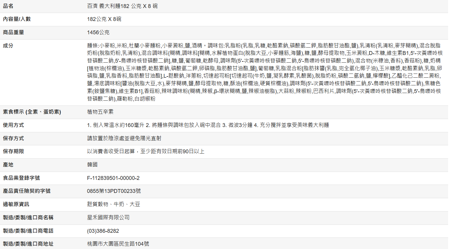 【好市多代購】百濟微辣白醬義大利麵 182 公克 X 8 碗