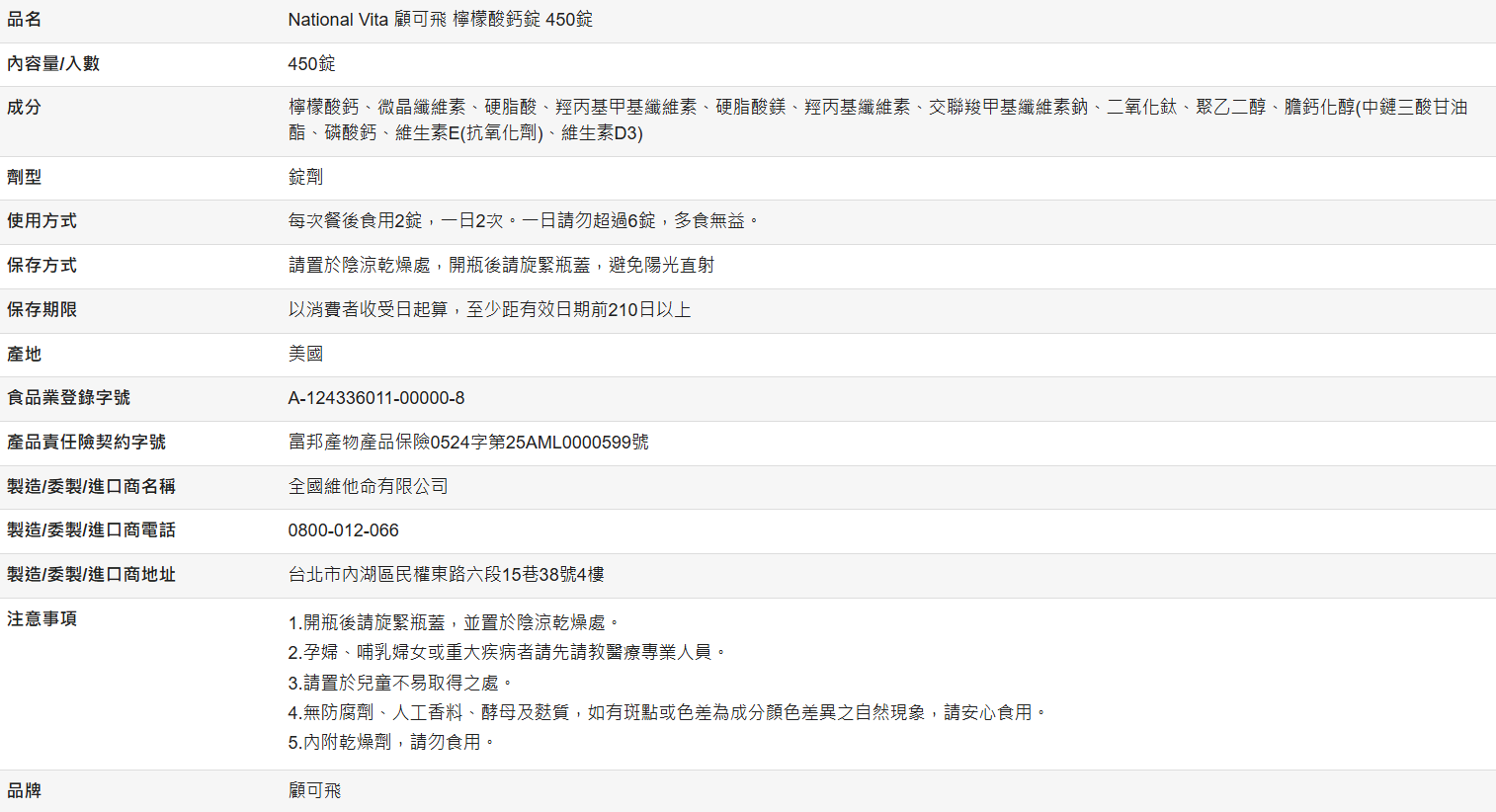【好市多代購】National Vita 顧可飛 檸檬酸鈣錠 450錠