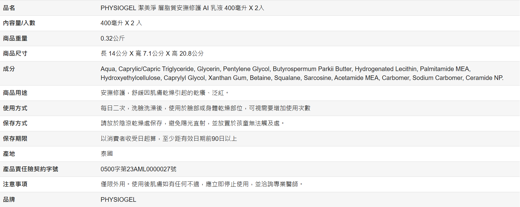 【好市多代購】PHYSIOGEL 潔美淨 層脂質安撫修護 AI 乳液 400毫升 X 2入