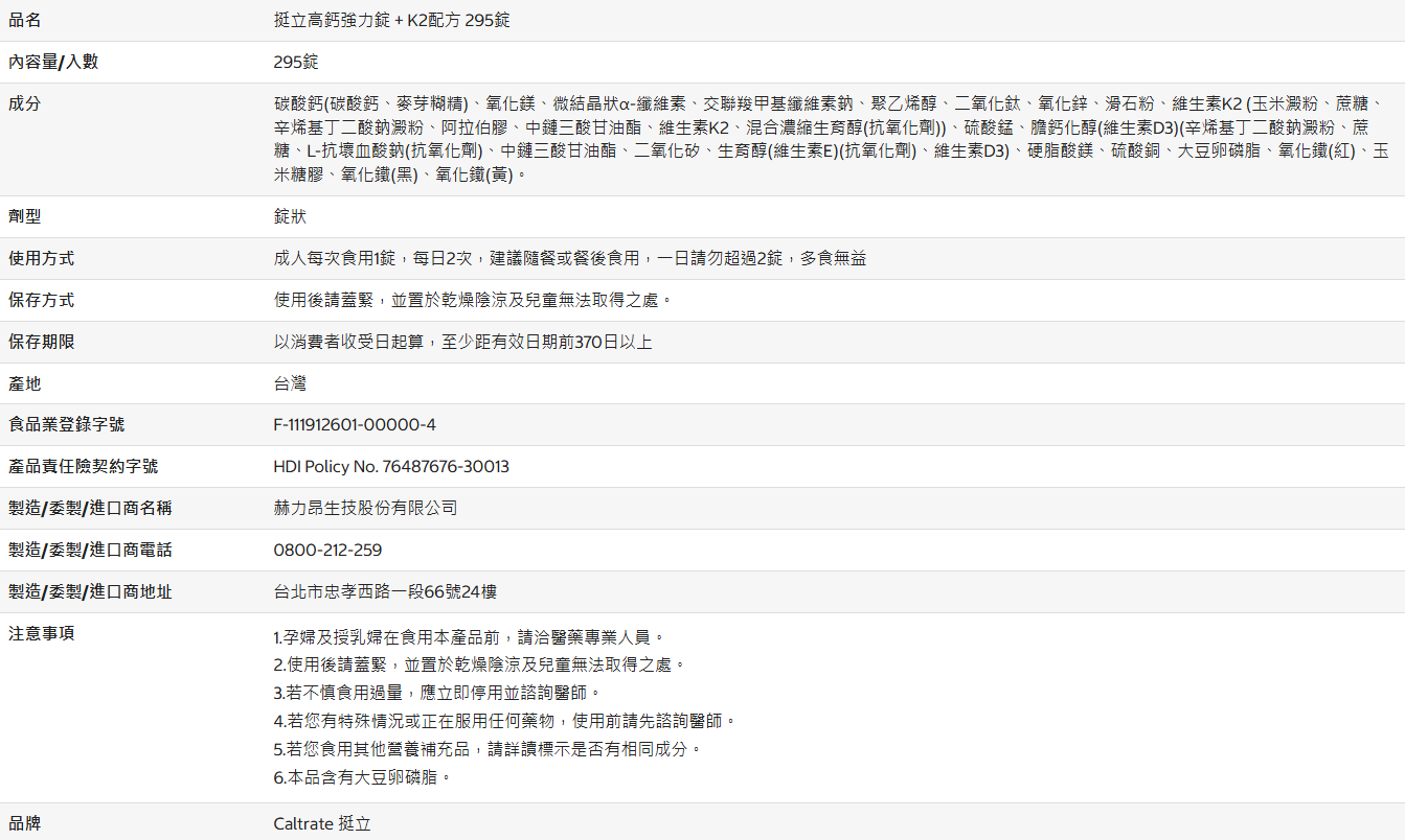 【好市多代購】挺立高鈣強力錠 + K2配方 295錠