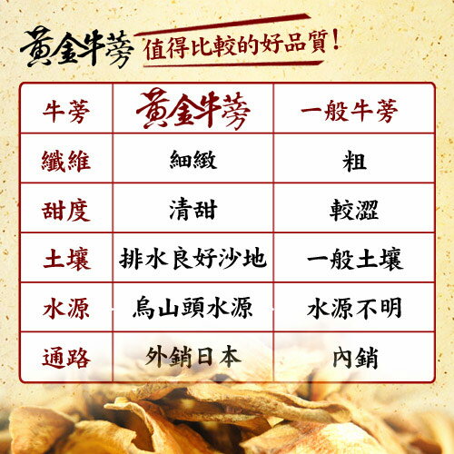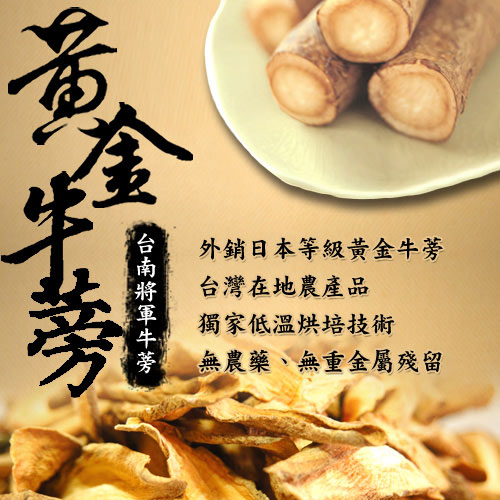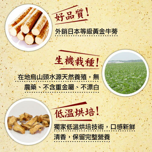 採用台灣在地種植新鮮牛蒡切片,獨家低溫烘培技術不破壞牛蒡的風味及成分,外銷日本指定等級最優的牛蒡,天然栽種口感新鮮清香甘甜,未經二氧化硫漂白延長保存,忠於原味原色,將牛蒡營養完全保留。
