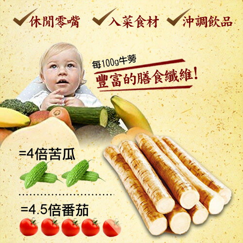 新鮮牛蒡原片保留牛蒡營養,一般加工保健食品膠囊錠劑狀無法取代,營養更適合人體自然吸收,大人小孩可以當休閒零嘴直接食用;全家人或素食者營養與美味的絕佳食材。