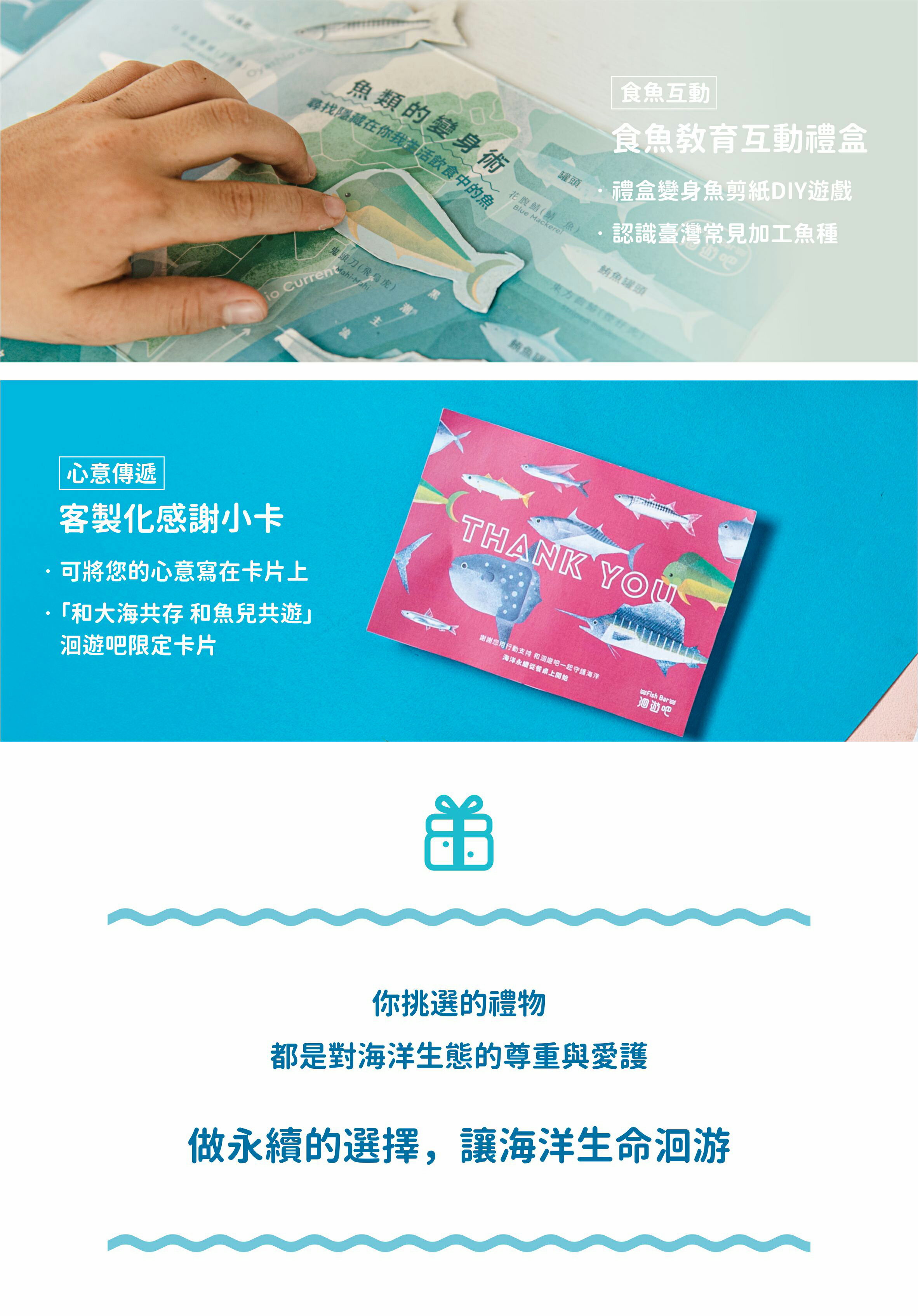 【臺灣魚之島禮盒】洄遊吧特別款設計,具食魚教育的禮盒,透過DIY互動圖版遊戲組【魚類的變身術】,認識臺灣常見加工魚種。