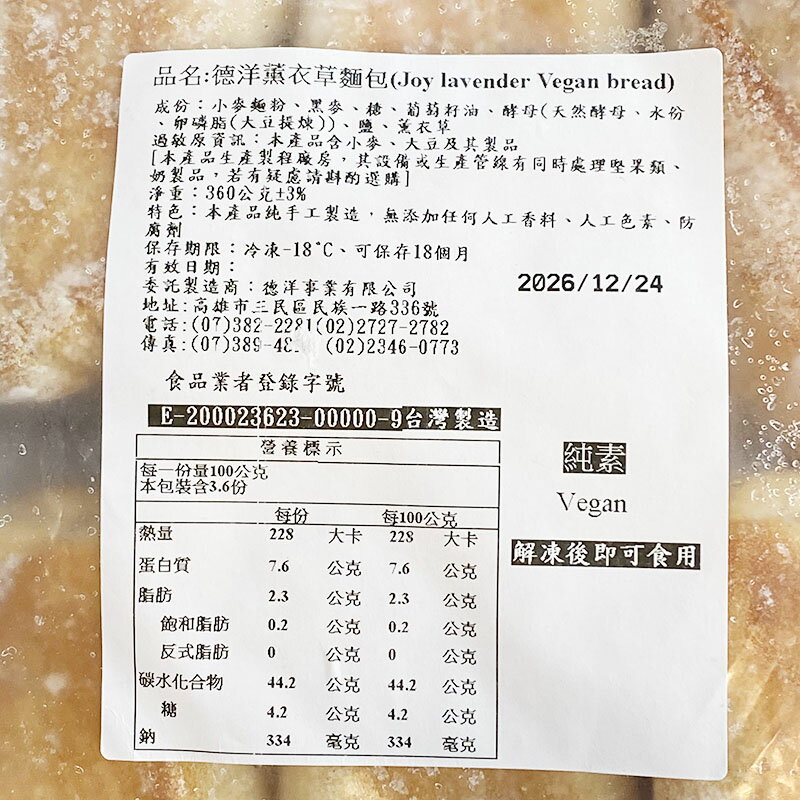 成分:小麥麵粉、、黑麥、糖、葡萄籽油、酵母(天然酵母、水份、卵磷脂(大豆提煉))、鹽、薰衣草
