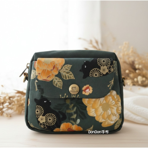 深沉的墨綠底色,低調中藏著華麗。金色貓咪與盛放的芍藥,如同繡線般精緻織就,在不經意間閃耀著細膩的光芒。一款專屬於您的手工小方包,讓每一次日常出門,都帶有獨特的優雅與寵溺。