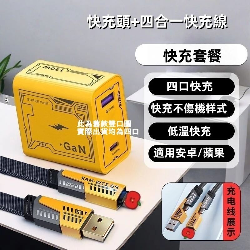 全新未拆品,袋裝。 購買本商品贈送Micro USB充電線1條(贈品詳見商品圖) 包裝內容物:120W四口快充頭×1+四合一編織快充線×1 充電頭尺寸:7×4.5×2.7cm 四合一快充線長度:約1米