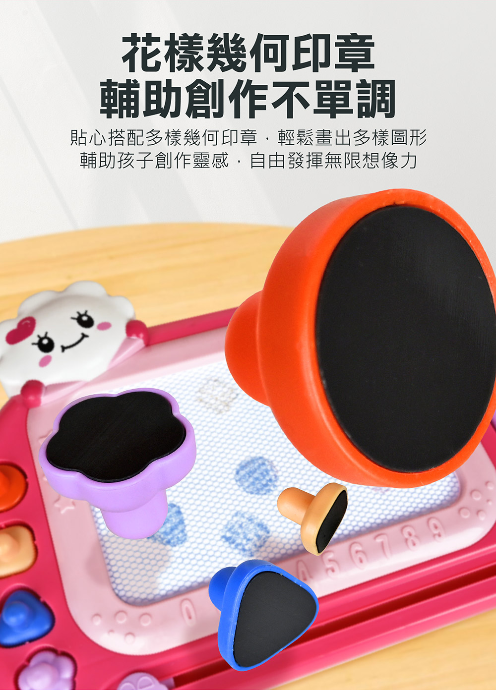 搭配四種可愛造型印章,幫助孩子認識基本形狀,同時為每次創作增添趣味與巧思。