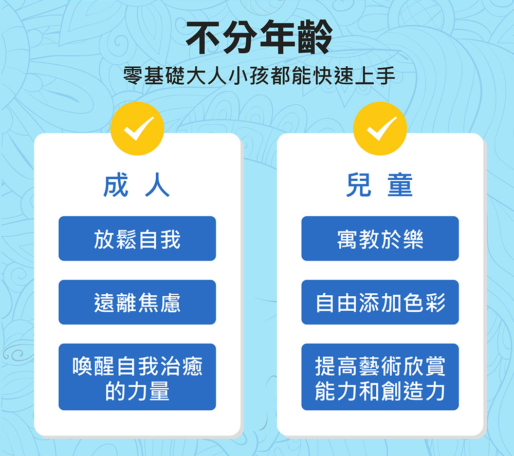 家長與孩子也可以一起繪圖,討論色塊區域該怎麼分配色系,不僅能在著色過程中能讓心情平靜,煩惱和焦慮也能被抒發,轉而改以創意完成飽含藝術特色、數一數二獨特的作品!