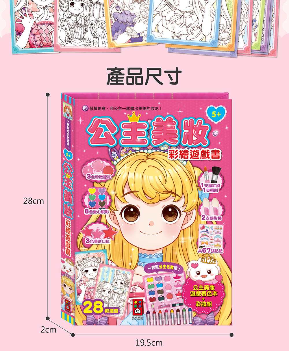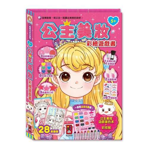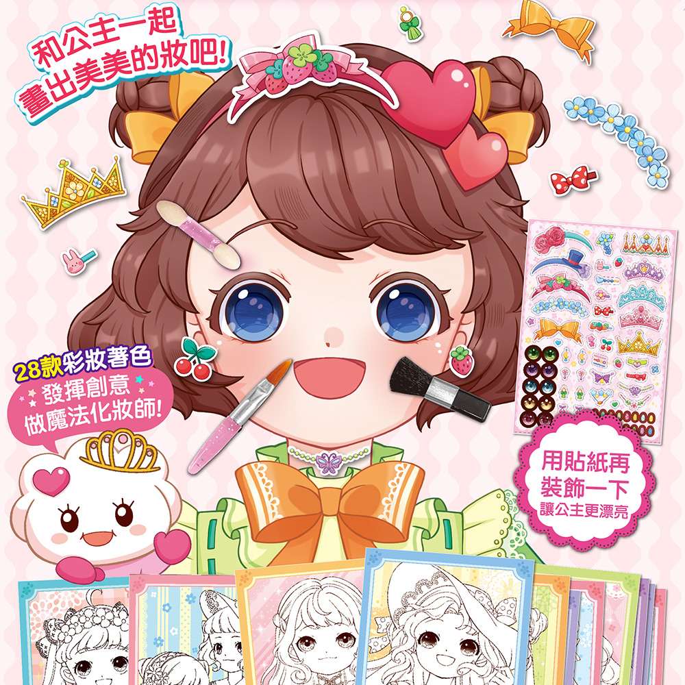 另有彩繪遊戲書,可以幫書中的公主們著色,並且嘗試幫公主畫上美麗的妝容,並且配合貼紙,可以貼上美瞳、美甲、髮夾等裝飾,讓孩子盡情發揮創意,揮灑藝術美感,打造屬於自己的風 格,同時在著色過程中也能促進手眼協調,強化肌肉發展,滿足孩子們對於化妝的好奇心。