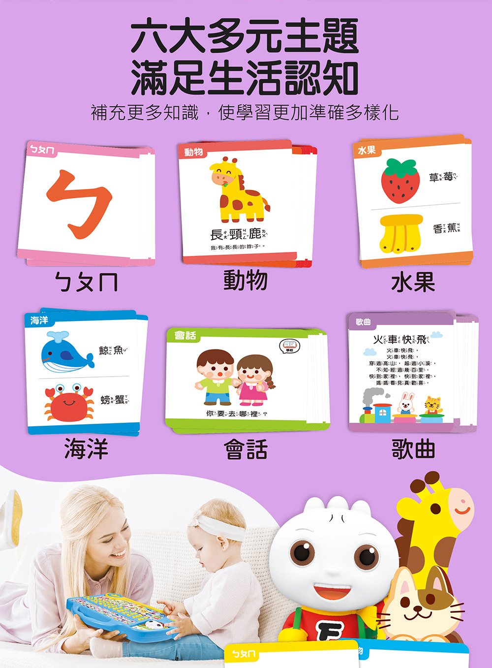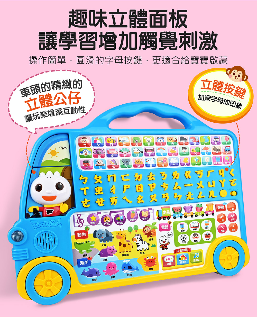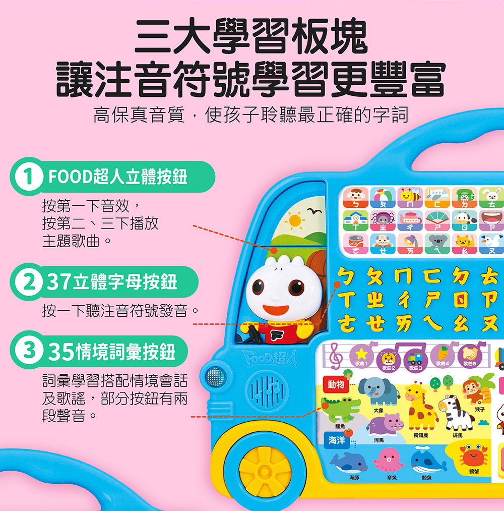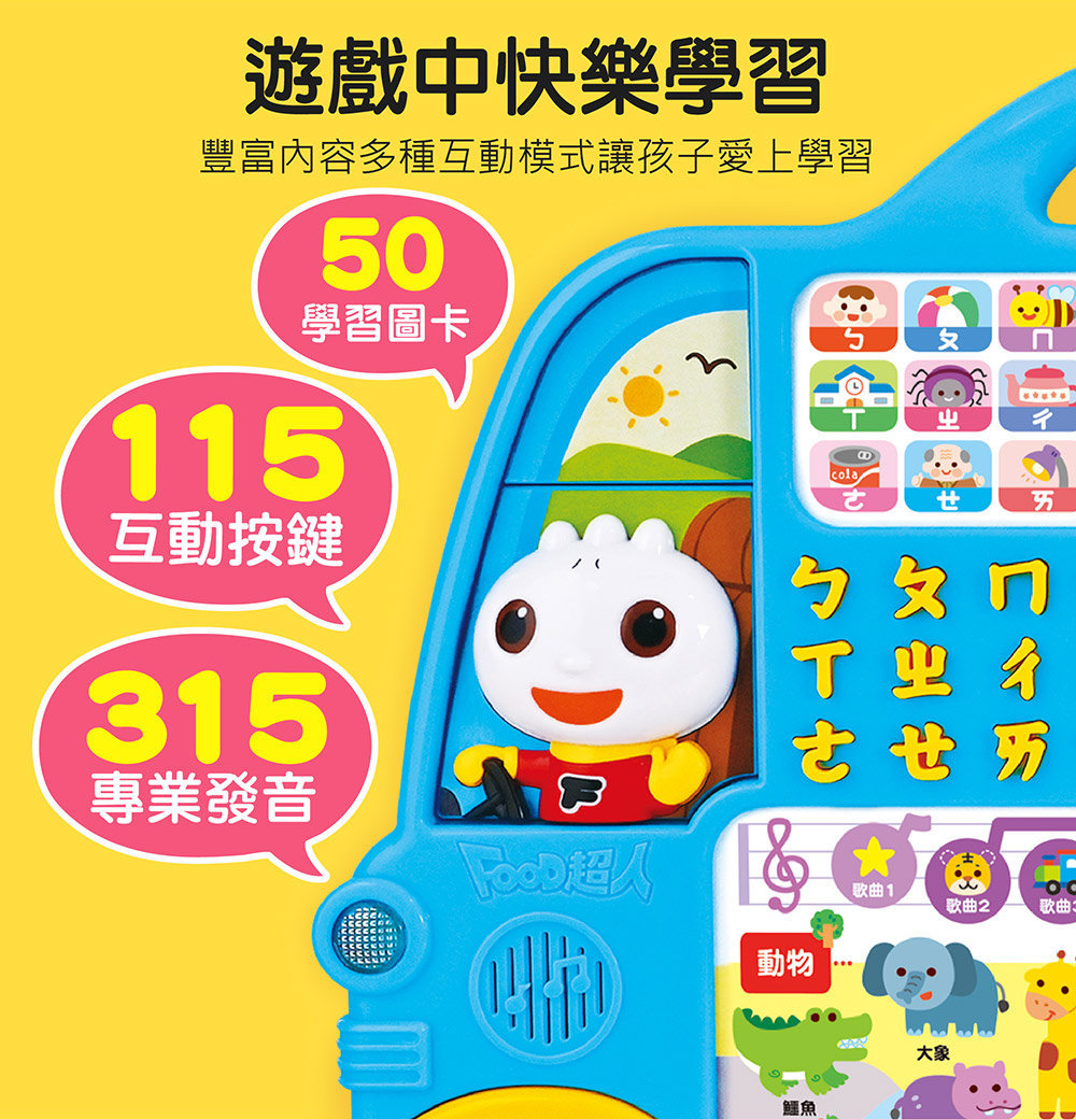 跟著注音巴士出發吧!115個按鈕、315個聲音,搭配50張學習圖卡,多功能拼音學習,讓孩子樂在其中!