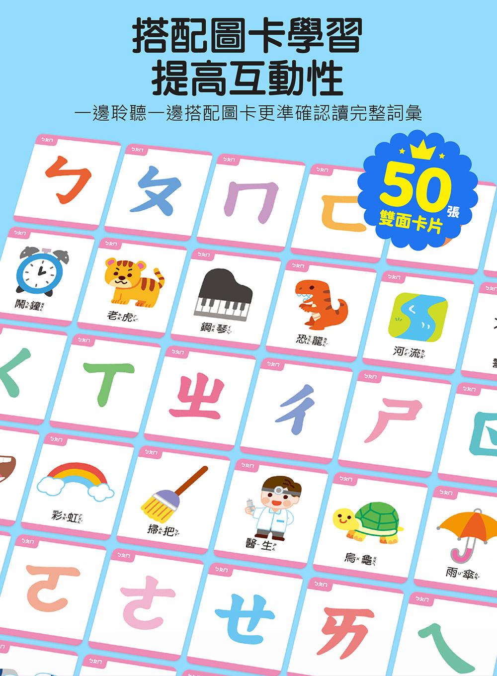 各個學習區域搭配不同遊戲設計,趣味的找一找遊戲、可以反覆練習的拼音遊戲以及注音接龍的基礎遊戲,讓孩子能在遊玩中學習!搭配50張圖卡,補充更多知識,使學習更加準確多樣化。