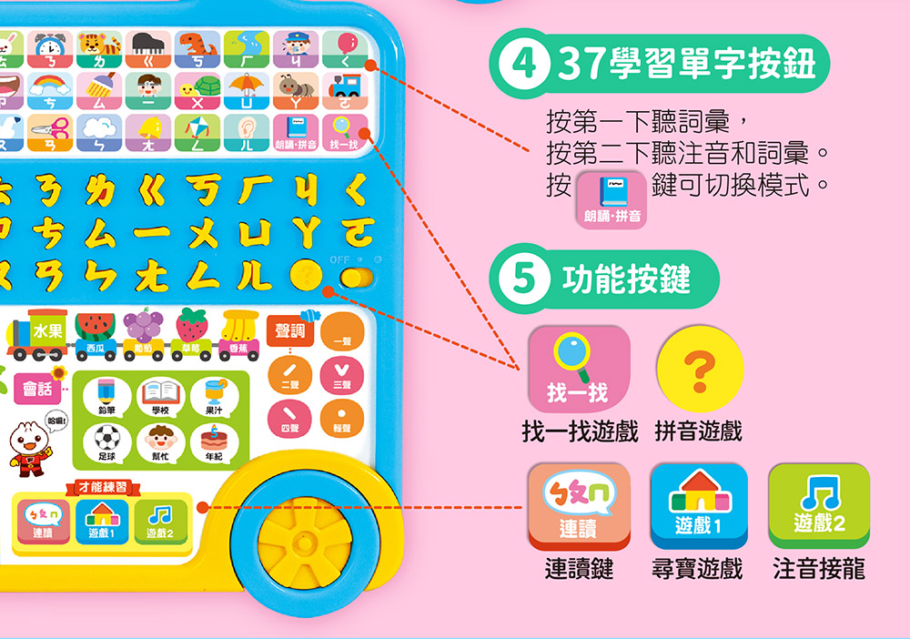 圓滑不磨手的符號按鍵,讓學習增加觸覺刺激,加深注音符號的印象,車頭的精緻的立體公仔,讓玩樂的增添互動性。