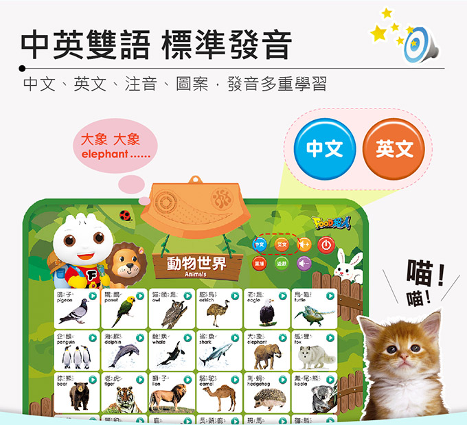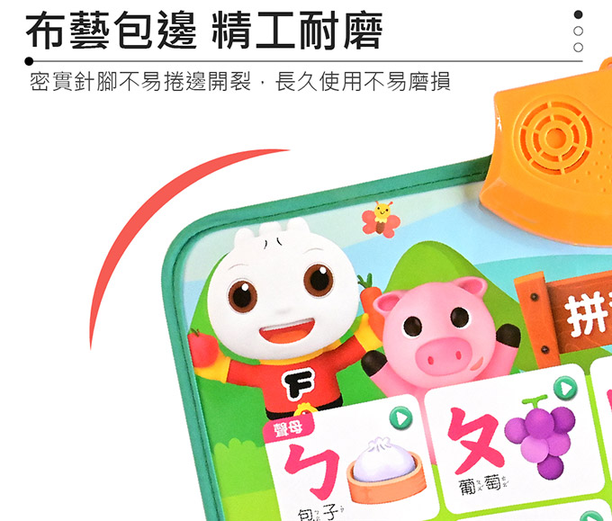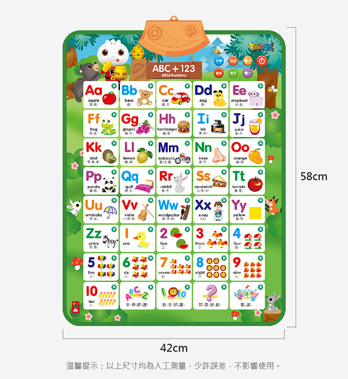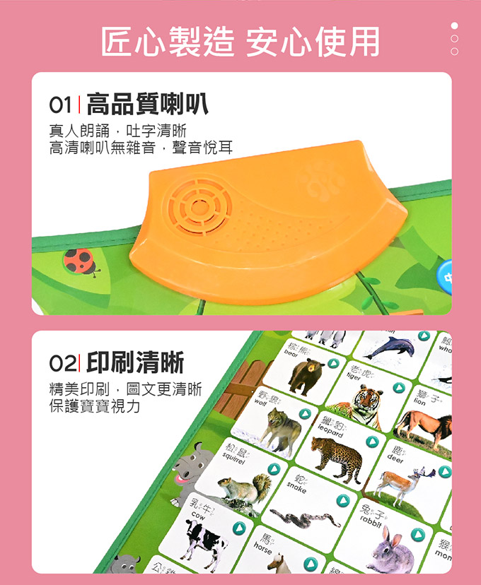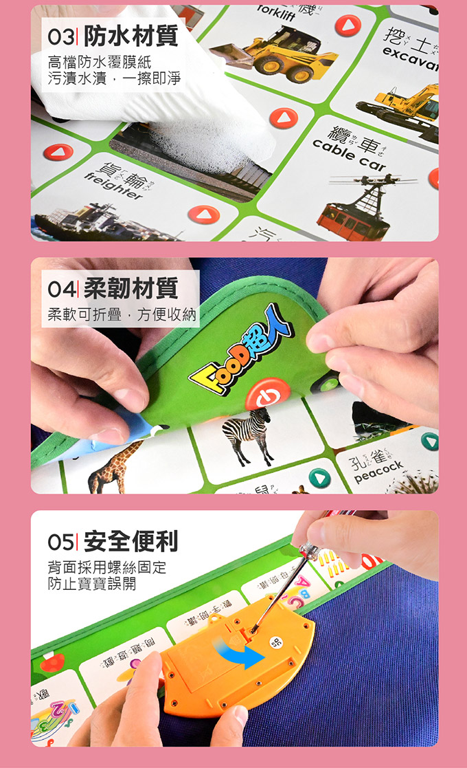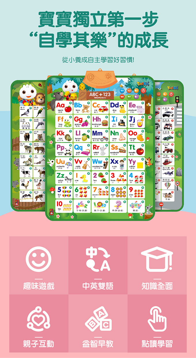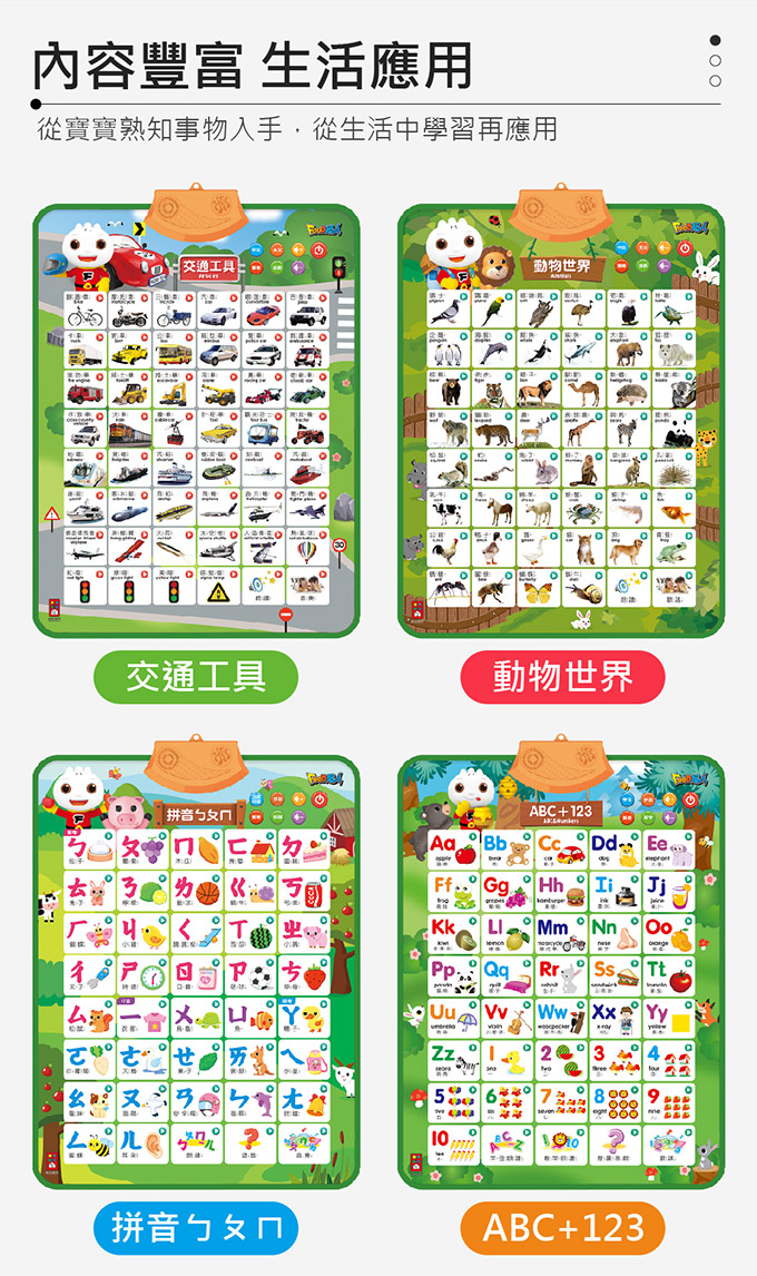 本產品採用防潑水鍍膜與撕不破設計,利用無紡布圓角包邊,不會被紙劃傷手或是掛圖輕易折到毀壞,質感更加倍!家長可將掛圖掛在牆上,鮮豔活潑又可愛的插圖吸引孩子目光,觸控有聲設計能讓孩子自主學習,家長也可在一旁輔助教學,共享親子學習時光。