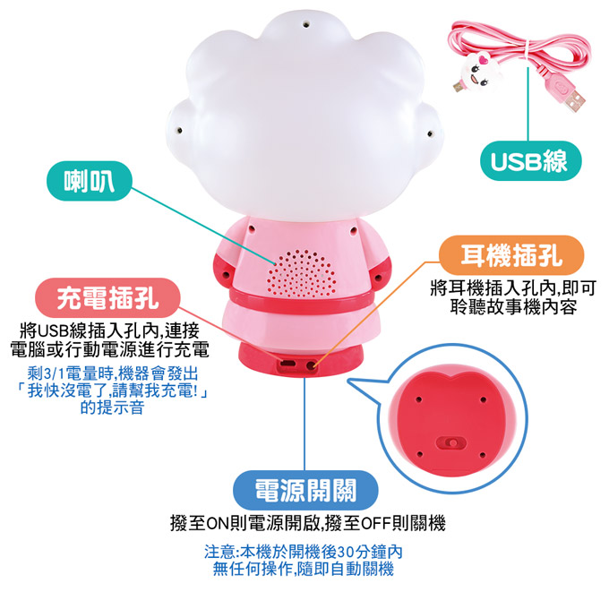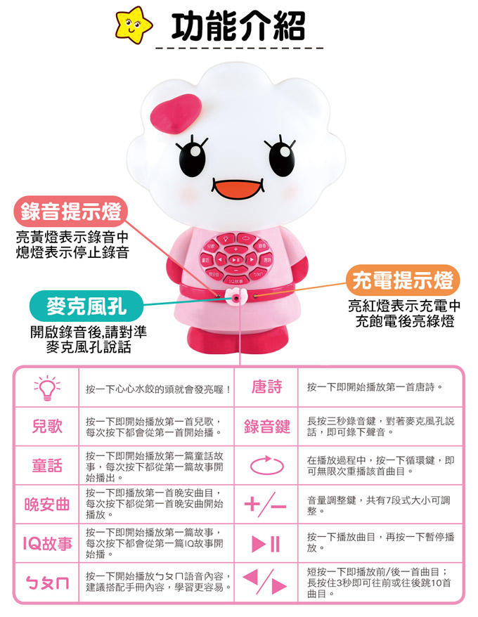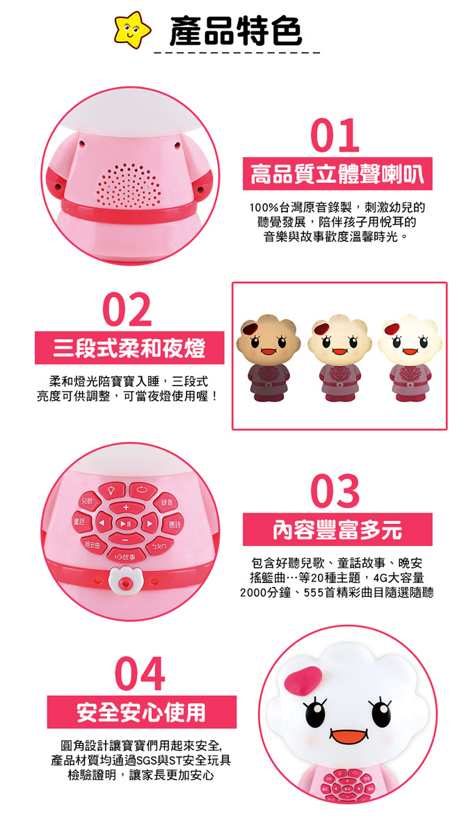 包含好聽兒歌、童話故事、晚安搖籃曲、寶寶智慧故事、基礎ㄅㄆㄇ和ABC單字教學、成語故事、唐詩、三字經、弟子規…等20種主題,4G大容量2000分鐘、555首精彩曲目隨選隨聽。