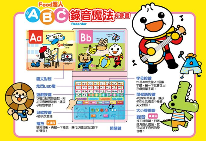 透過錄音的魔法,聽、說、讀、寫全方位學習,跟著Food超人一起大聲唸唸看,輕鬆學會ABC吧!