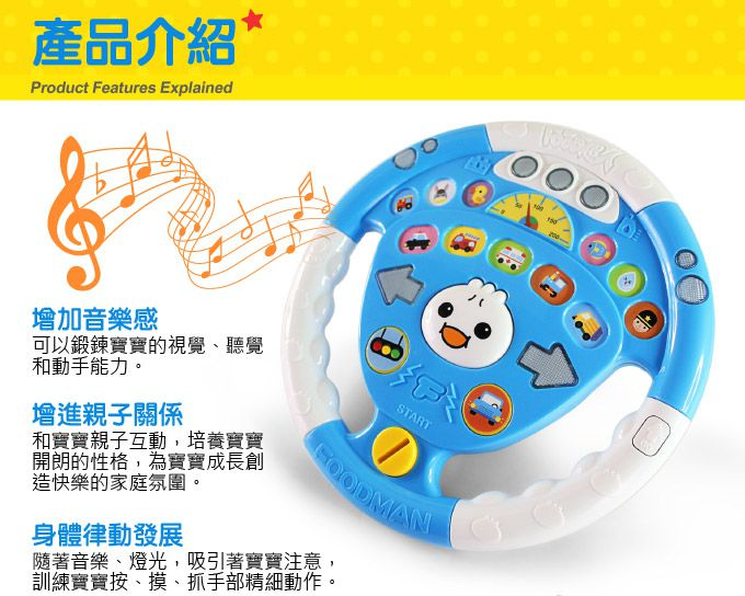 方向盤外型擬真,操作功能豐富,擁有喇叭、引擎聲、方向燈、車燈、紅綠燈……等多種逼真的聲光效果,絕對讓孩子愛不釋手。