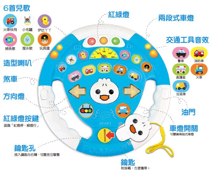 ◎FOOD超人鑰匙:全台第一款附鑰匙的玩具方向盤,將鑰匙插入鑰匙孔後向右轉,可聽見引擎聲。附贈掛繩,攜帶方便不易弄丟。