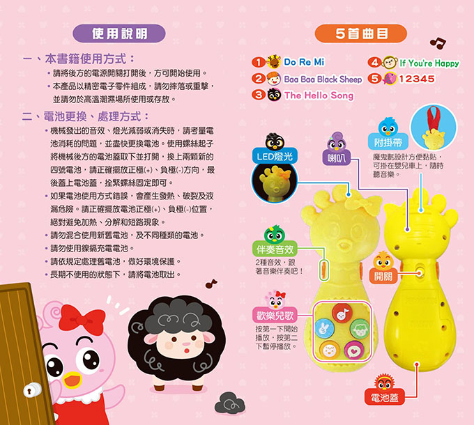 5首有趣輕快的英文歌謠,搭配2種打擊音效,讓寶寶隨著音樂伴奏歡唱。