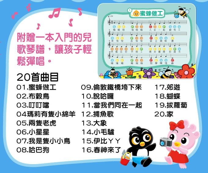 ★20首童謠樂譜-附贈一本入門的兒歌琴譜,樂譜清楚標示音符名稱,並附上完整中文歌詞,初學者容易學習。