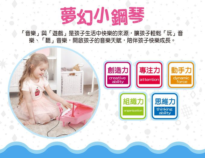 學古典鋼琴的最佳入門教具,培養幼兒手眼協調能力及音樂創造力,24鍵鋼琴讓孩子能彈出最簡易又耳熟能詳的兒歌,帶來自信與成就感。