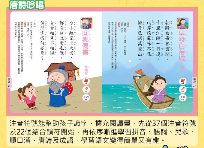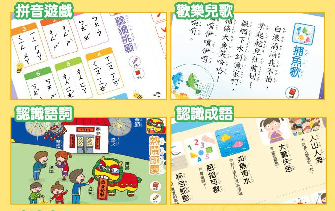 先從37個注音符號及22個結合韻符開始,再循序漸進學習拼音、語詞、兒歌、順口溜、唐詩及成語,學習語文變得簡單又有趣。