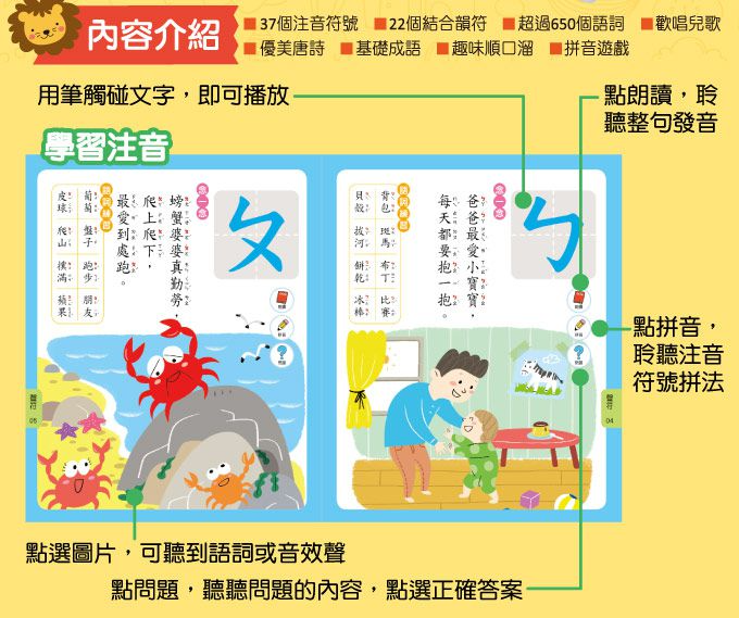 《正音ㄅㄆㄇ互動點讀繪本上冊》列出完整的37個注音符號與22個結合韻符,學習全方位不遺漏。