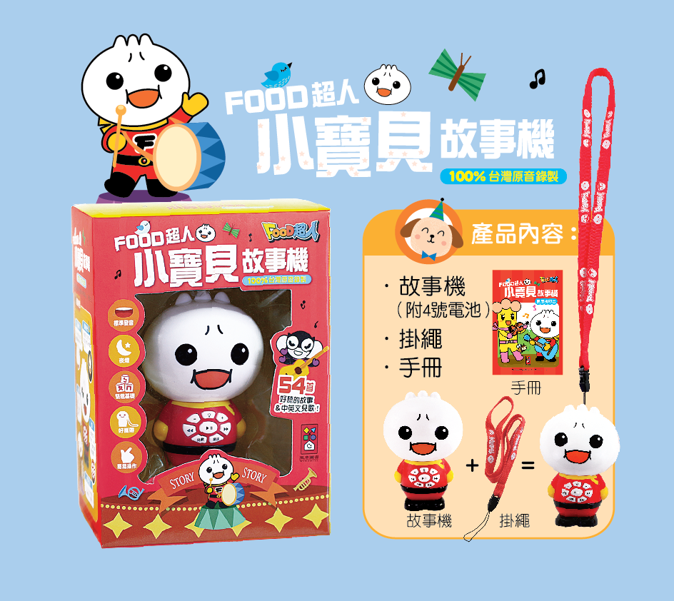 ★內容物/贈品:1台Food超人小寶貝故事機+1條掛繩+1本使用說明手冊
