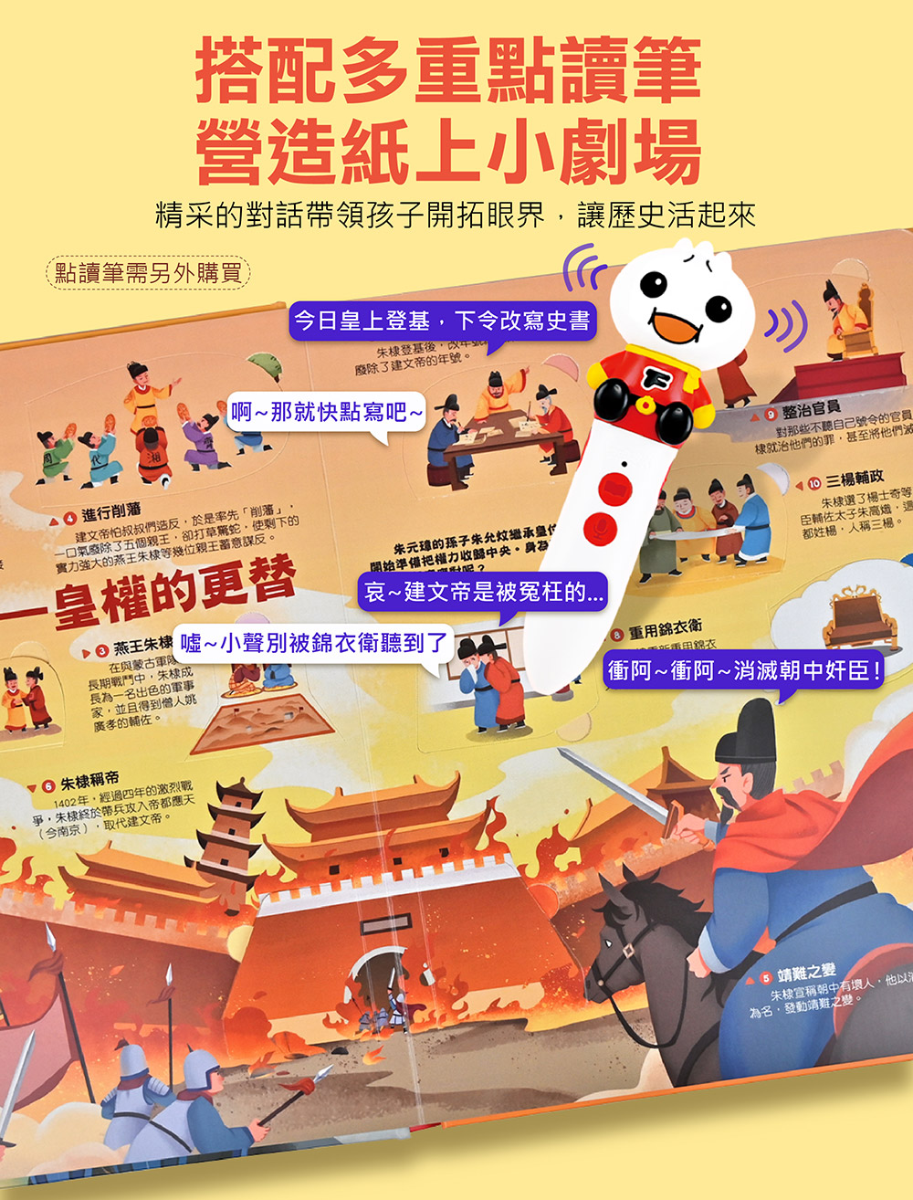 超過70種歷代場景,精美的全景插畫、清晰的時間脈絡、深刻的歷史事件切入點,精準捕捉歷史足跡,帶領孩子穿越時空,翻閱過去歷史,在閱讀時彷彿身歷其境,讓閱讀不再無聊、枯索無 味,翻翻+點讀,全面提升閱讀興趣,輕鬆看圖學歷史!