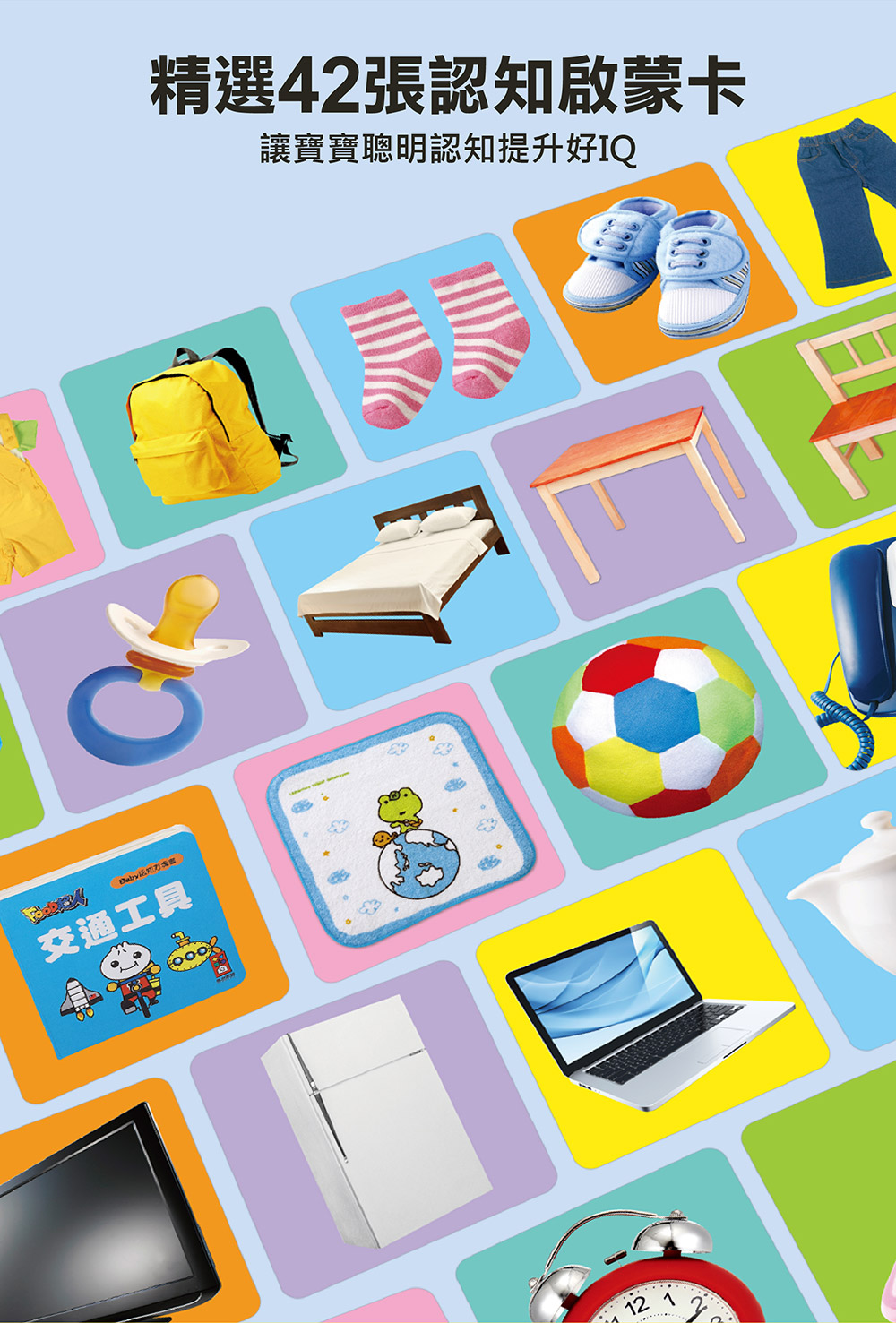 包含衣服、背包、床、書桌、毛巾、電話……等42種孩子最熟悉的生活用品寫實照片,不同於一般的插畫字卡,給寶寶最真實的認知學習。