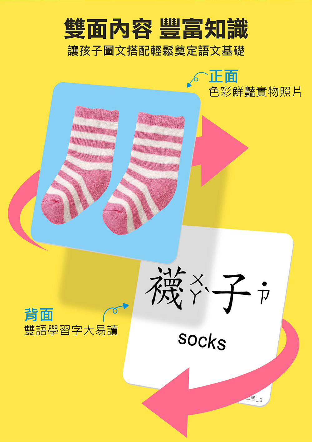 圖卡背面皆有中英文雙語名稱,並附上注音,字大清晰容易閱讀,讓孩子在認識各種生活用品的同時學習識字,聰明提升好IQ!