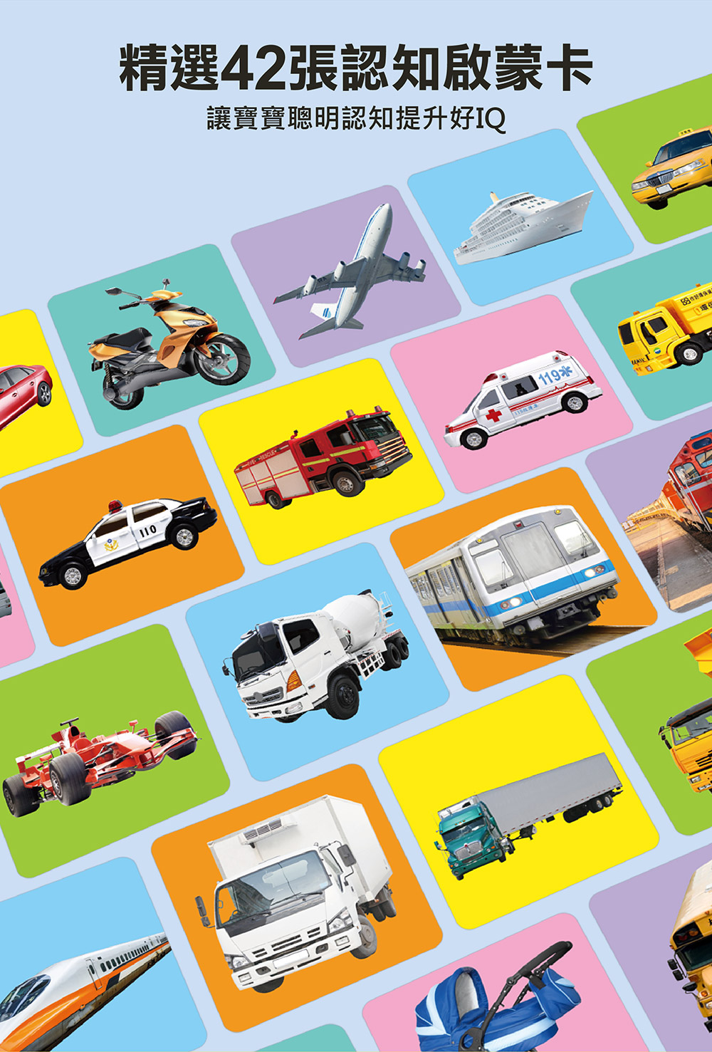 包含汽車、火車、警車、船、飛機、火箭……等42種陸、海、空運輸工具寫實照片,不同於一般的插畫字卡,給寶寶最真實的認知學習。