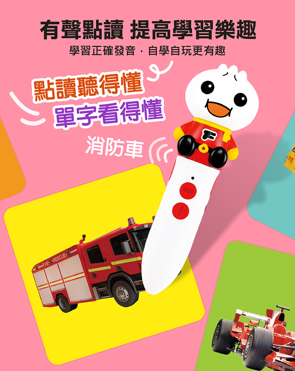 可支援FOOD超人多重點讀筆,學習正確發音,能自學自玩,讓圖卡變得更有趣!